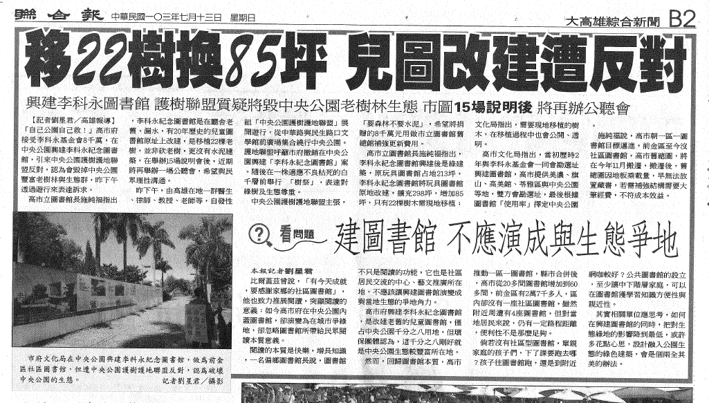 7月13聯合報B2_移22樹換85坪兒圖改建遭反對